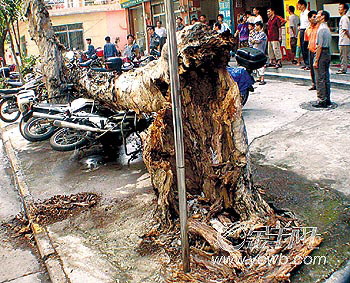 核心提示:廣州東山區竹絲崗四馬路一棵七層樓高、重千余斤的老樹被一陣大風刮倒,當時正在樹旁邊聊天的六位市民嚇了一跳,快速向兩邊跑散開去。“哇!好險!”目瞪口呆地望著大樹將下邊一排摩托車壓個正著,目擊者陳先生的頭皮...